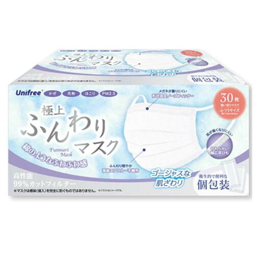 unifree極上ふんわりマスク(ふつうサイズ) ブリッツマスクPFE・EBF・VFE 99%以上カット カケン試験による ソフト 痛くない耳紐 30枚入 不織布 大人用 使い切り 3層構造 花粉 ウイルス対策 飛沫防止 普通サイズ 風邪予防 花粉対策