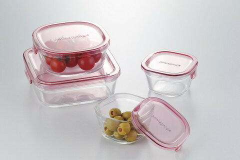イワキ iwaki 耐熱ガラス 保存容器 グラスコンテナ 角型4点セット ピンク PSC-PRN4P1 電子レンジ対応 食洗機対応 シンプル【送料無料】