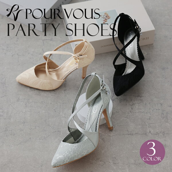 大人の女性を演出 ------------------------------------------------------------ クロスしたベルトとラメヒール、レース生地など大人っぽい魅力が詰まったパンプス。